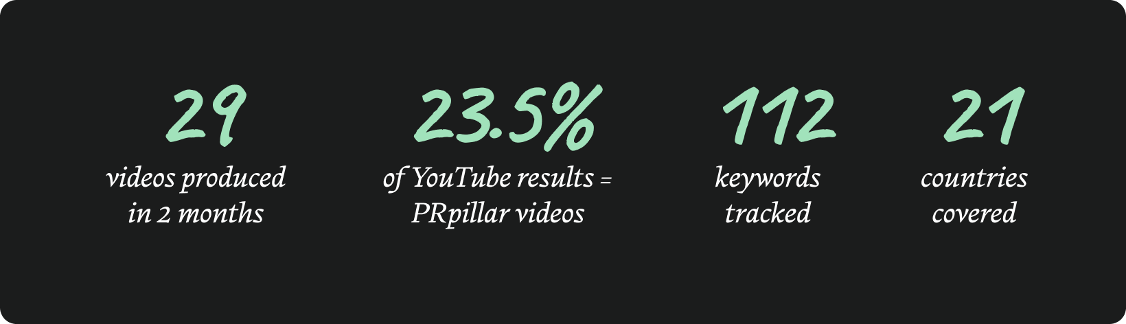 23.5% of all YouTube search results for tracked brand keywords. 29 videos. 21 countries. 112 keywords. And the results are only going to compound as the videos continue to age and accumulate watch time.