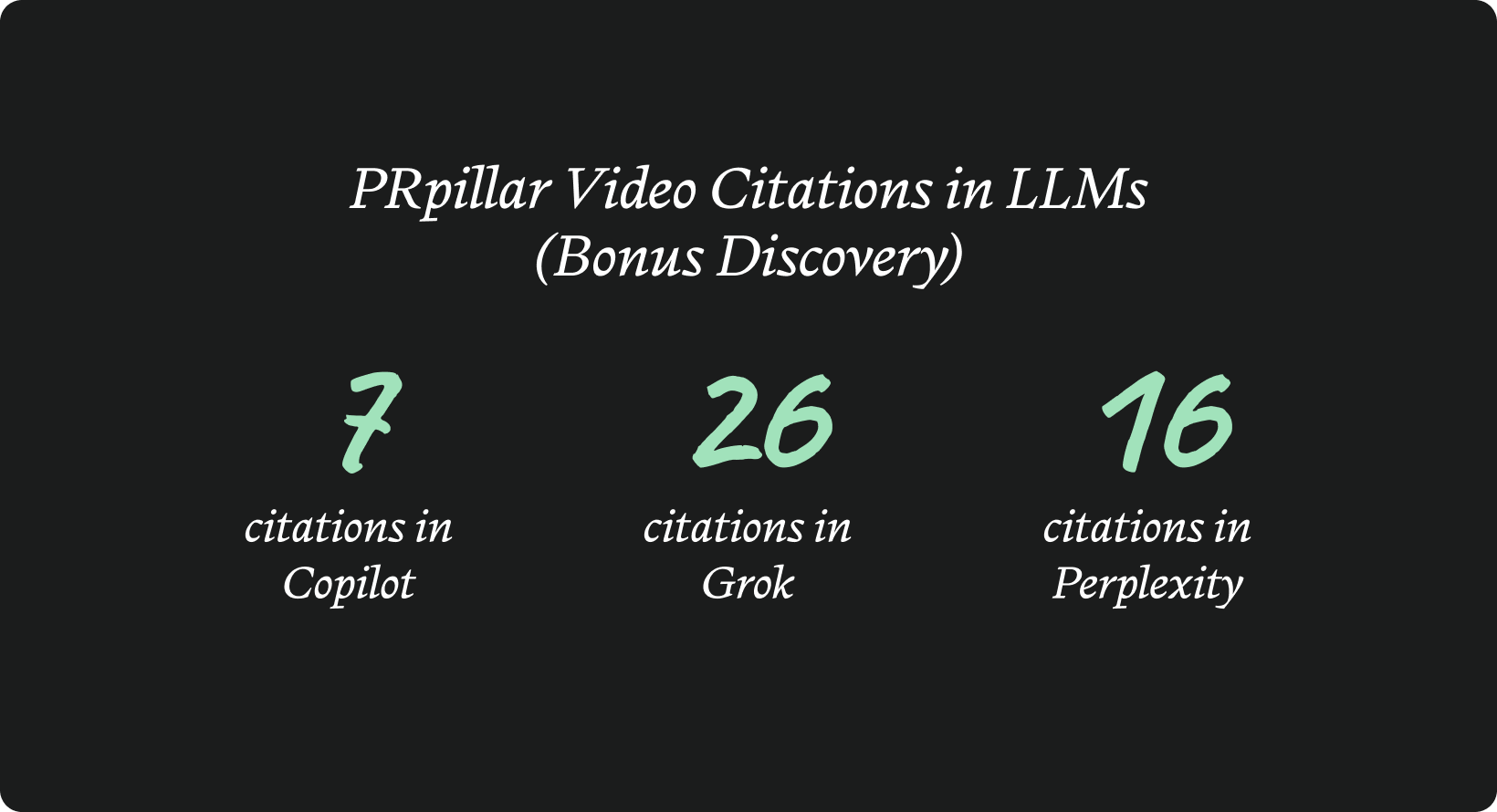 Three LLMs cited our videos: Copilot (7 citations), Grok (26 citations), and Perplexity (16 citations). Claude, ChatGPT, DeepSeek, Gemini, and Google AI Mode returned zero citations for our videos.